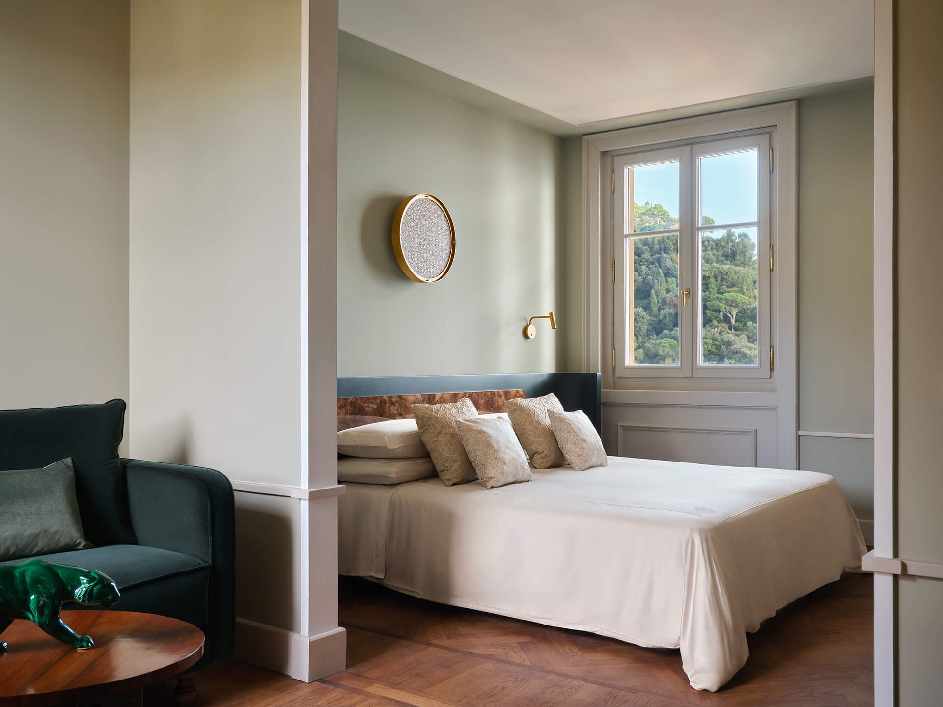 An infinity pool perches above the endless blue of the Ligurian Riviera, surrounded by the fragrant Giardino di Camillo, — a Mediterranean garden that fills the air with the scent of citrus groves, lavender, rosemary, and more. A grand communal table beneath the bougainvillea and an outdoor kitchen offer spaces for conviviality, while countless hidden nooks offer quiet retreats.