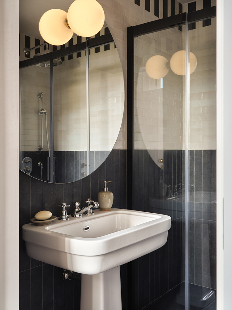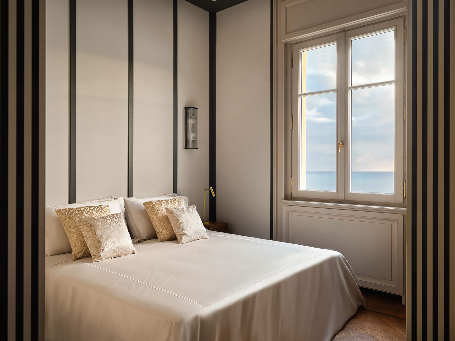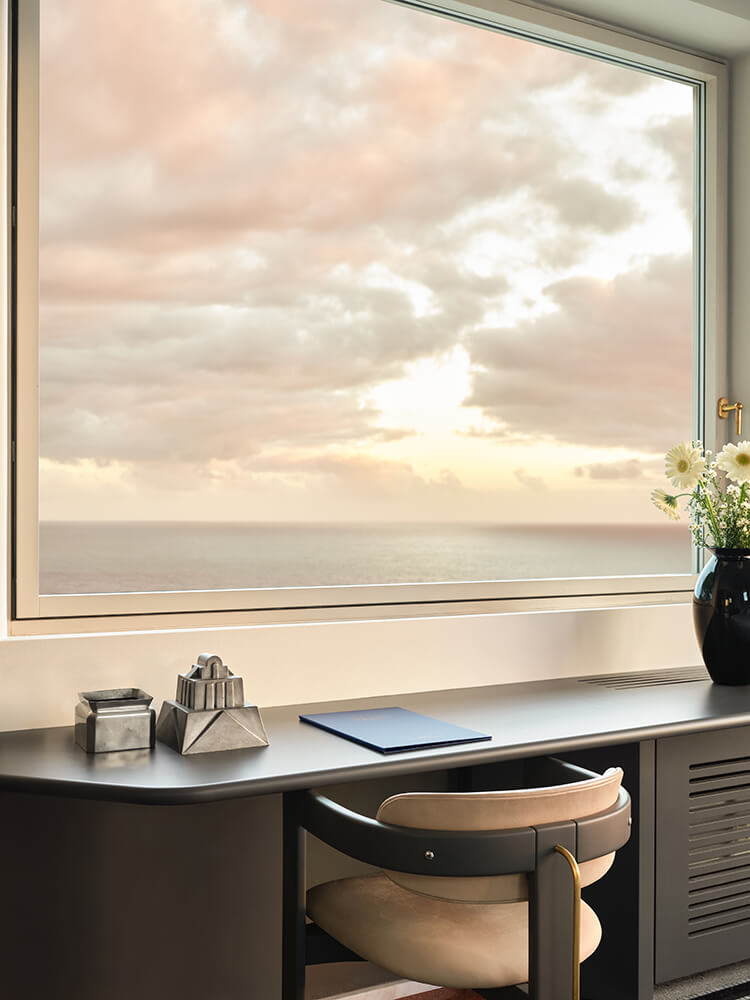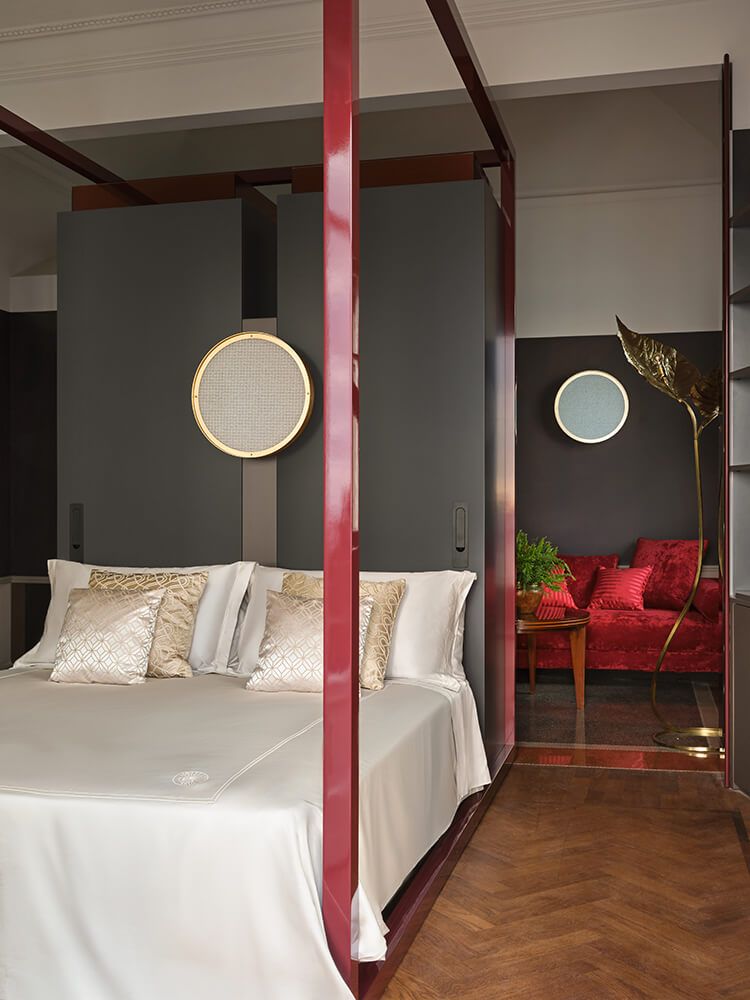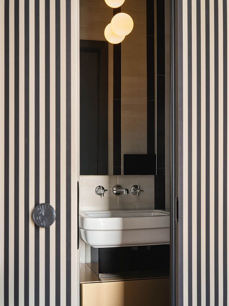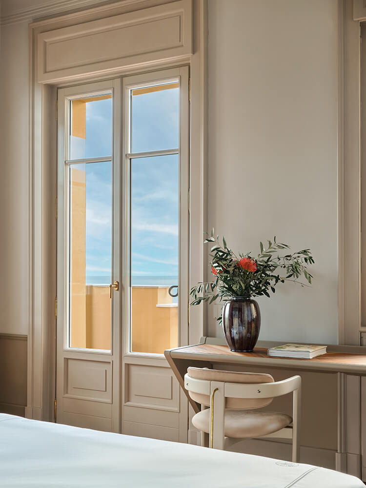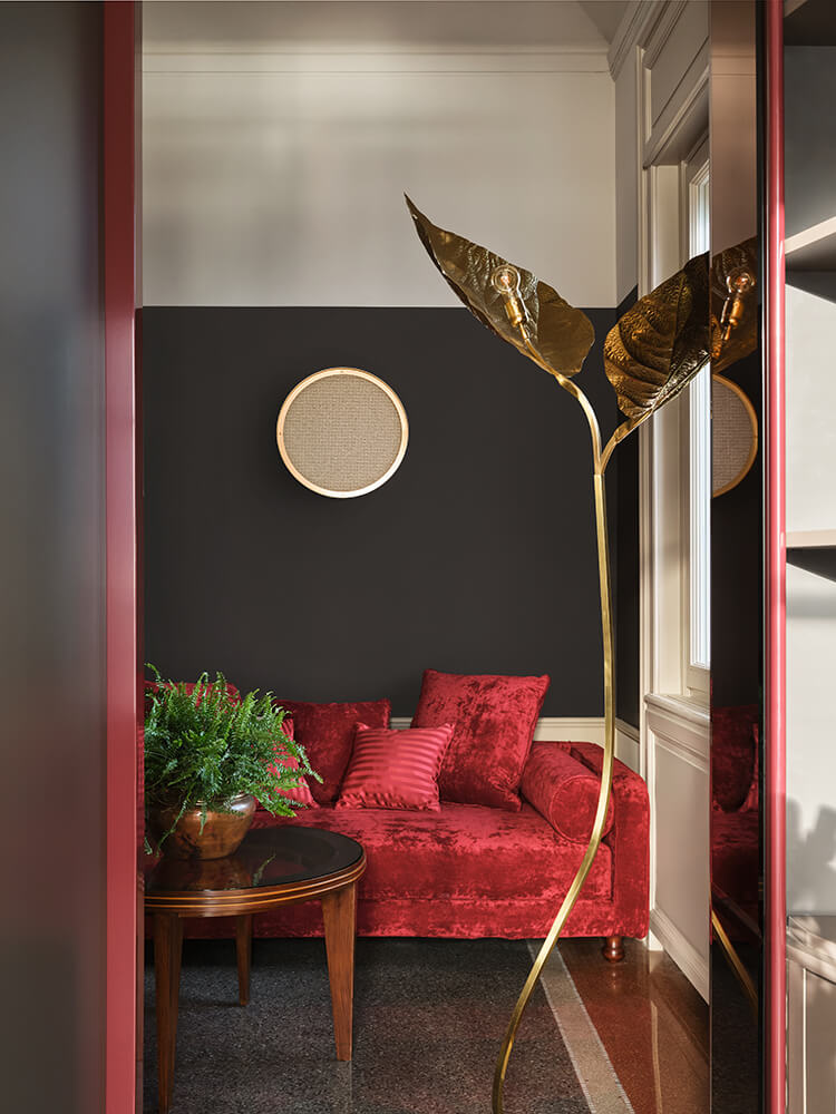 Each distinctive room reflects a thoughtful process of conservation and contemporary design, with inspiration drawn from the villa’s Art Deco-era origins.Details like custom hand-wrought brass Rabarbaro (rhubarb leaf) lamps by Bottega Gadda, bespoke closets and Chiavari chairs, a classic of the area and of Italian design, appear in a variety of iterations. Marble from nearby Carrara covers the grand staircase, for an elegant aesthetic of 20th century romance reimagined for modern life.